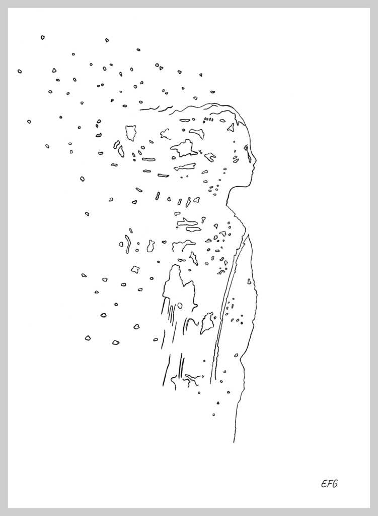 ‘Shattered’ is a black pen drawing on white Bockingford art paper A1 size. I created it in Summer 2024.